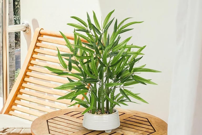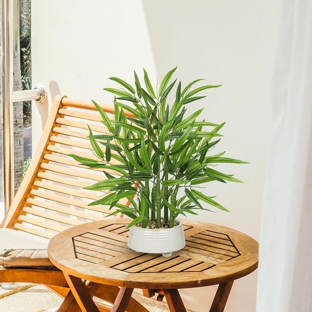 Artificial bamboo plant in white ceramic pot