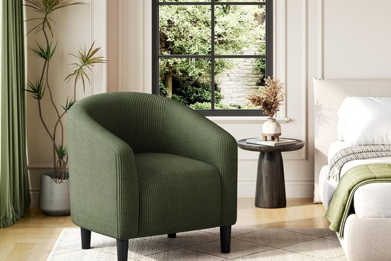 Forest green corduroy barrel accent chair