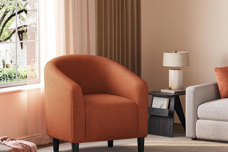 Rust corduroy barrel accent chair